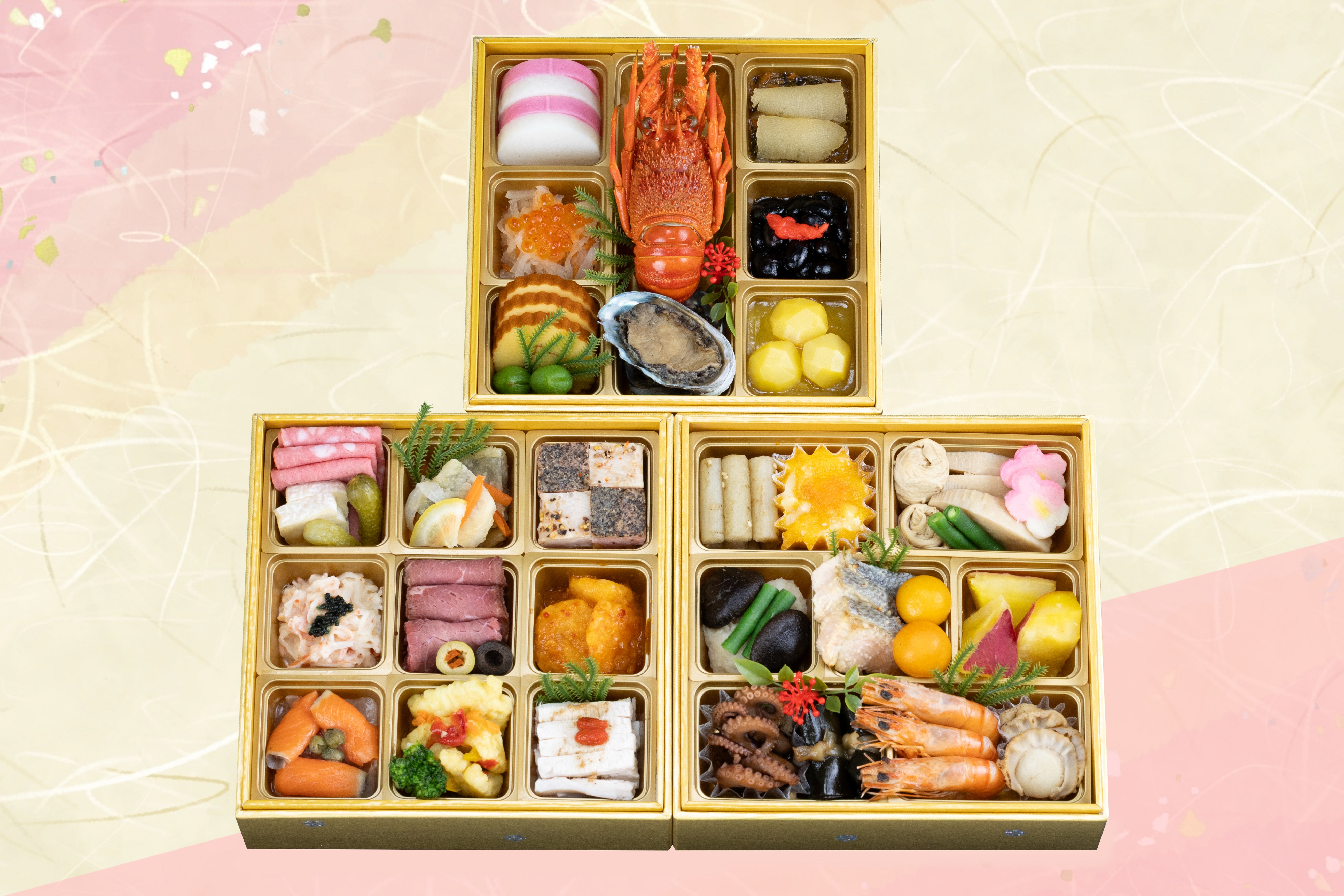 バラエティーにとんだ食べごたえのある和洋中の三段重。大ぶりのロブスターが彩りと豪華さを演出します。