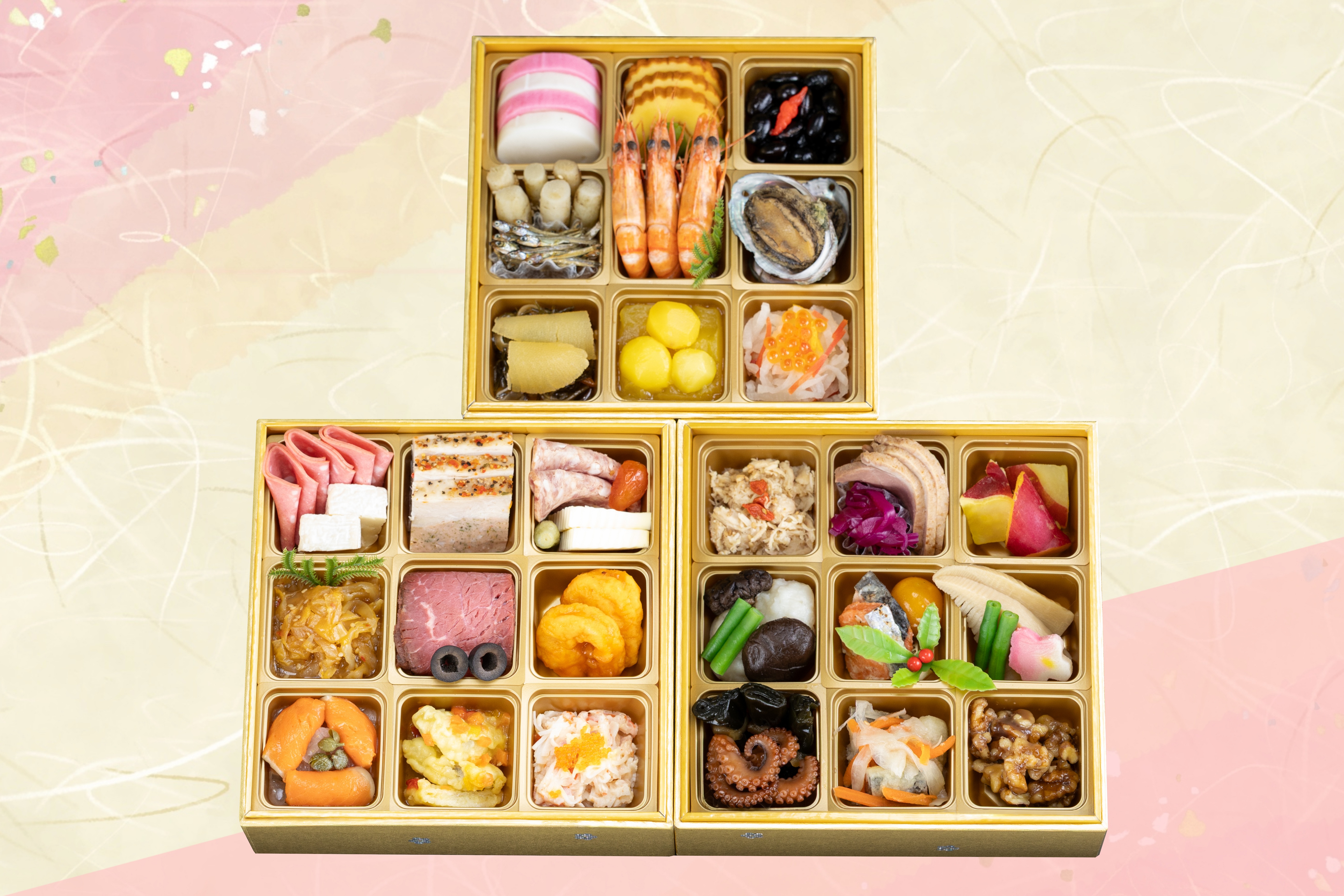 お正月に欠かせない定番の一品をお重いっぱいに盛り付けました。海老チリや中華クラゲなど、新たな一品が加わった三段重。